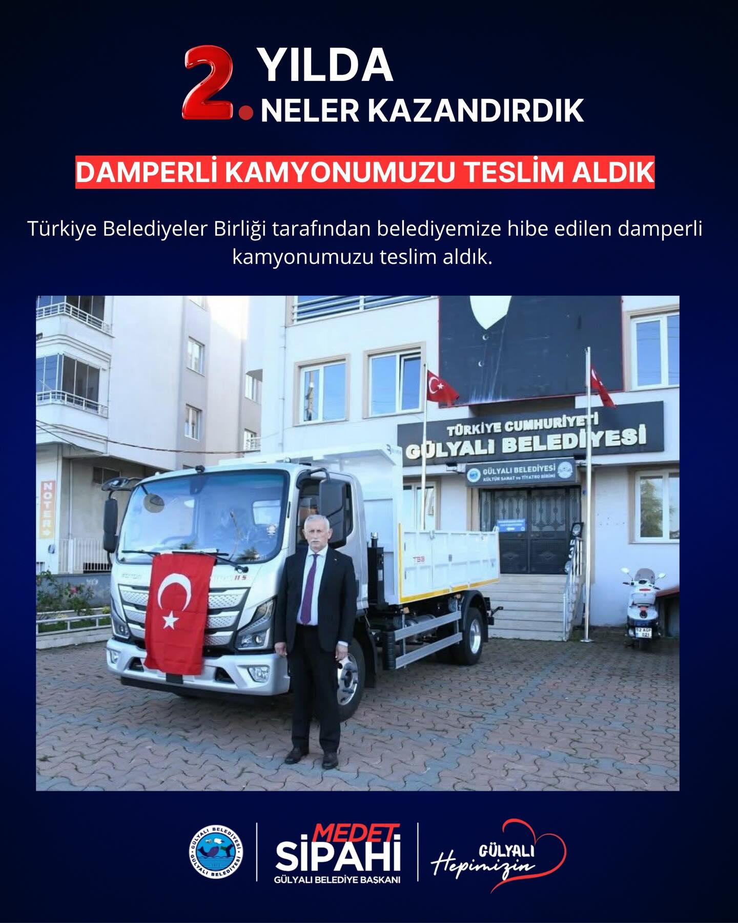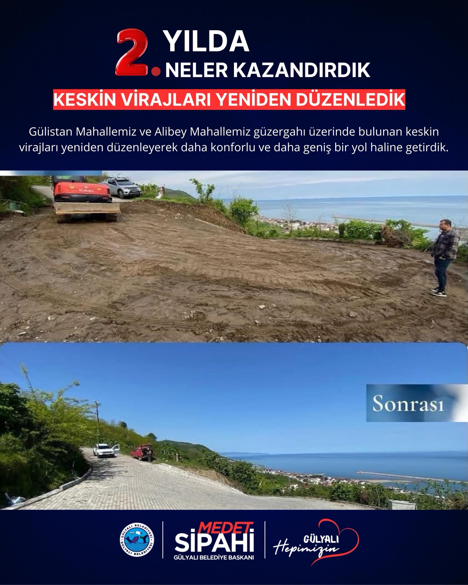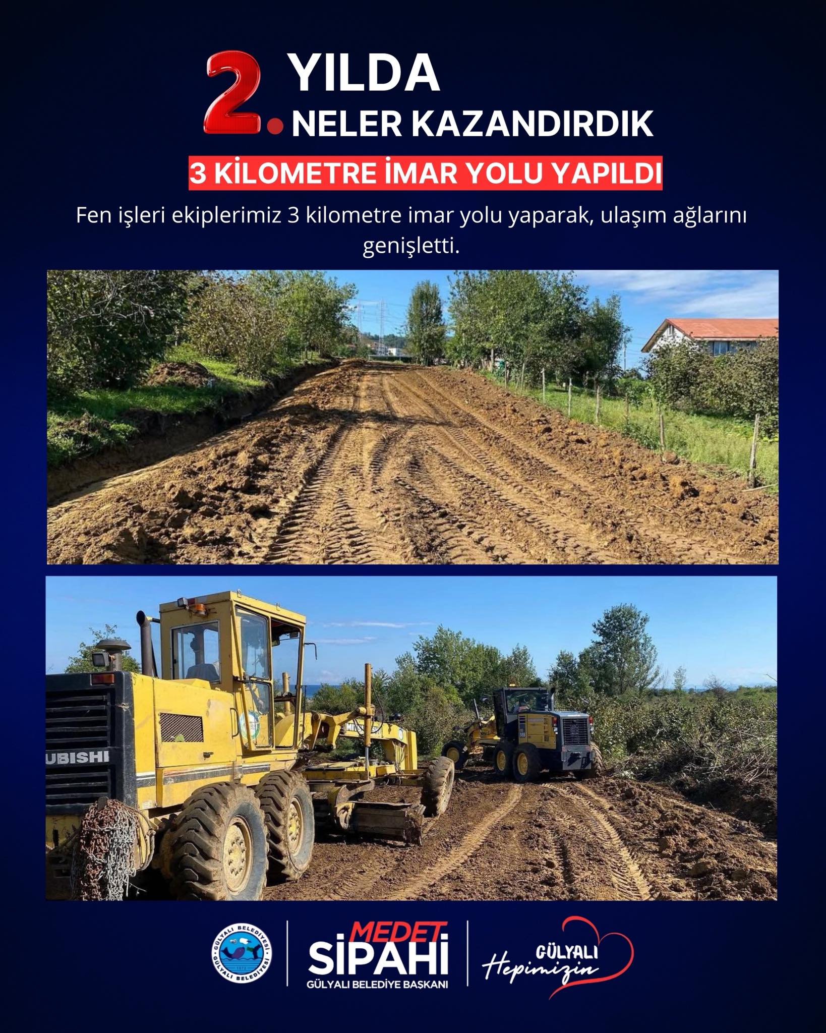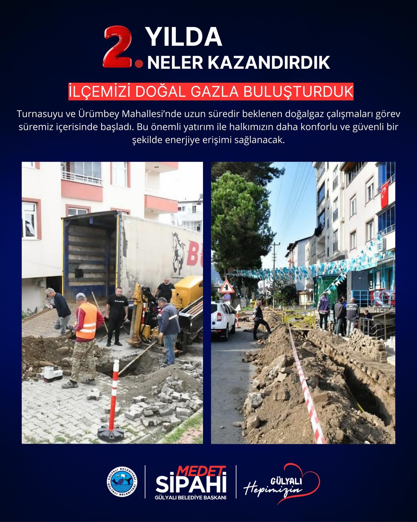 Başkan medet Sipahi; “ Göreve geldiğimiz andan itibaren şeffaf yönetim anlayışla Gülyalı’nın hizmetinde olduk. İlçemizin ihtiyaçları ve vatandaşlarımızdan gelen istekler doğrultusunda, altyapı ve üstyapı projelerinin hızlandırılması ve hayata geçirilmesi gibi konularda özveriyle çalışıyoruz. İki yılı geride bırakırken, hem mevcut projelerin tamamlanması hem de yeni yatırımların hayata geçirilmesi konusunda gayretle çalışacağız. Gülyalı halkına bir kez teşekkür ediyoruz, emanete sahip çıkacağız. Devraldığımız bu kutsal görevde, ilçemizi daha yaşanabilir, modern ve sürdürülebilir bir geleceğe taşıma kararlılığındayız. Şeffaf, katılımcı ve insan odaklı yönetim anlayışımızla, her bir vatandaşımızın sesine kulak vererek projelerimizi şekillendiriyoruz.”dedi.