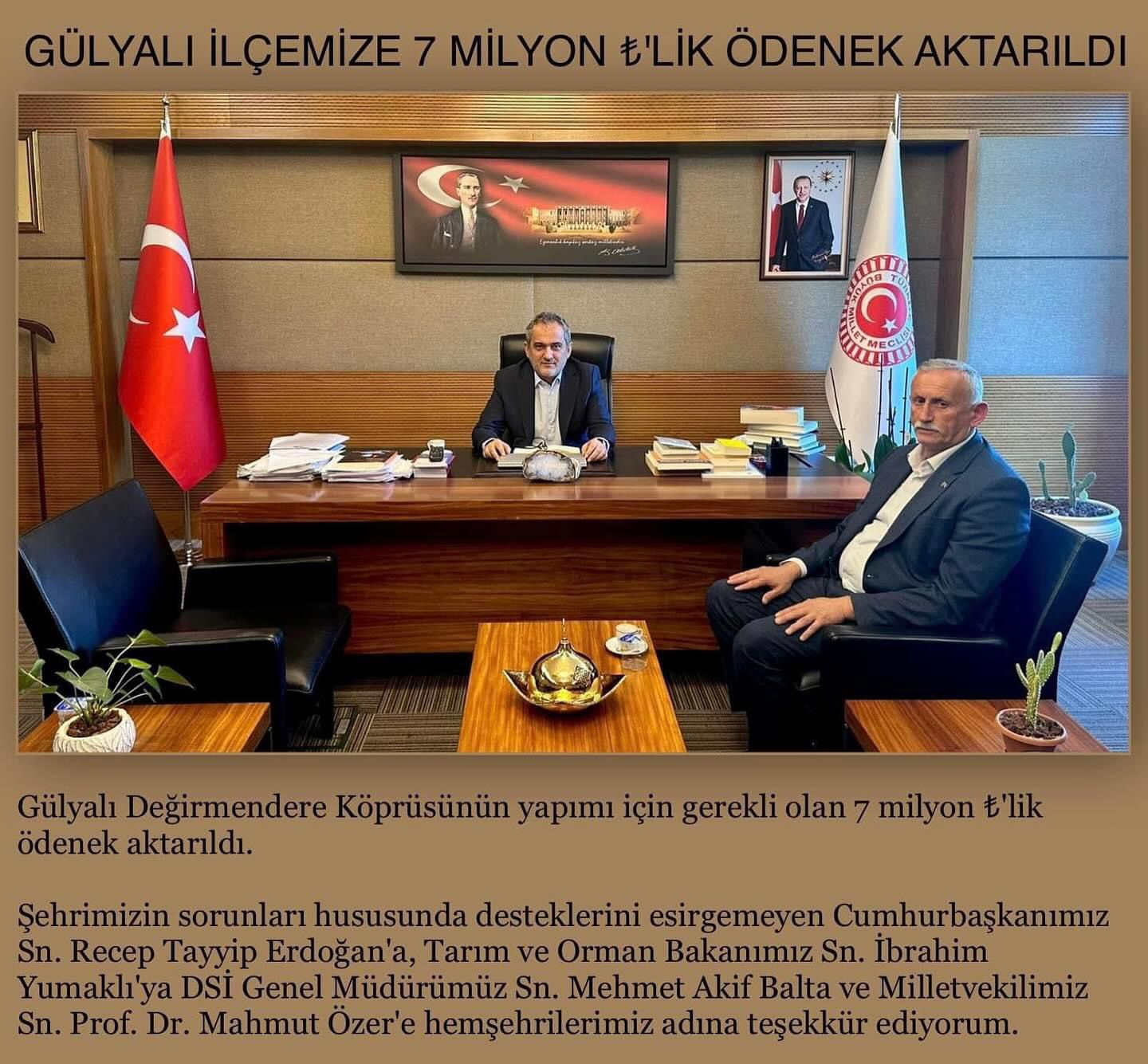 Gülyalı Değirmendere Köprüsü yapımı için, Tarım ve Orman Bakanımız ve DSİ Genel Müdürümüz ile görüşerek; kendilerinden Gülyalı’nın uzun zamandır beklediği köprü yapımına 7 Milyon TL’lik ödenek aktarılmasına vesile olan Ordu Milletvekilimiz Prof. Dr. Sn. Mahmut Özer Bakanımıza, Şahsım ve Gülyalı’lı hemşehrilerim adına şükranlarımı sunuyorum.